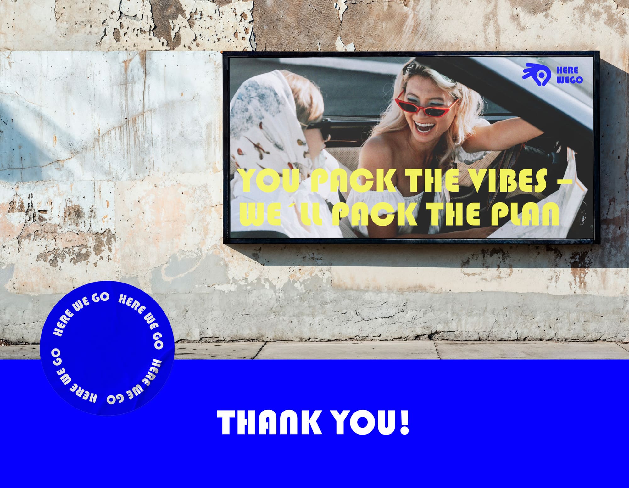 The logo combines a location pin with a hand gesture forming “OK,” symbolizing both the destination and the promise that everything will be taken care of. This playful yet confident symbol reinforces the idea that traveling with Here We Go is simple and worry-free.